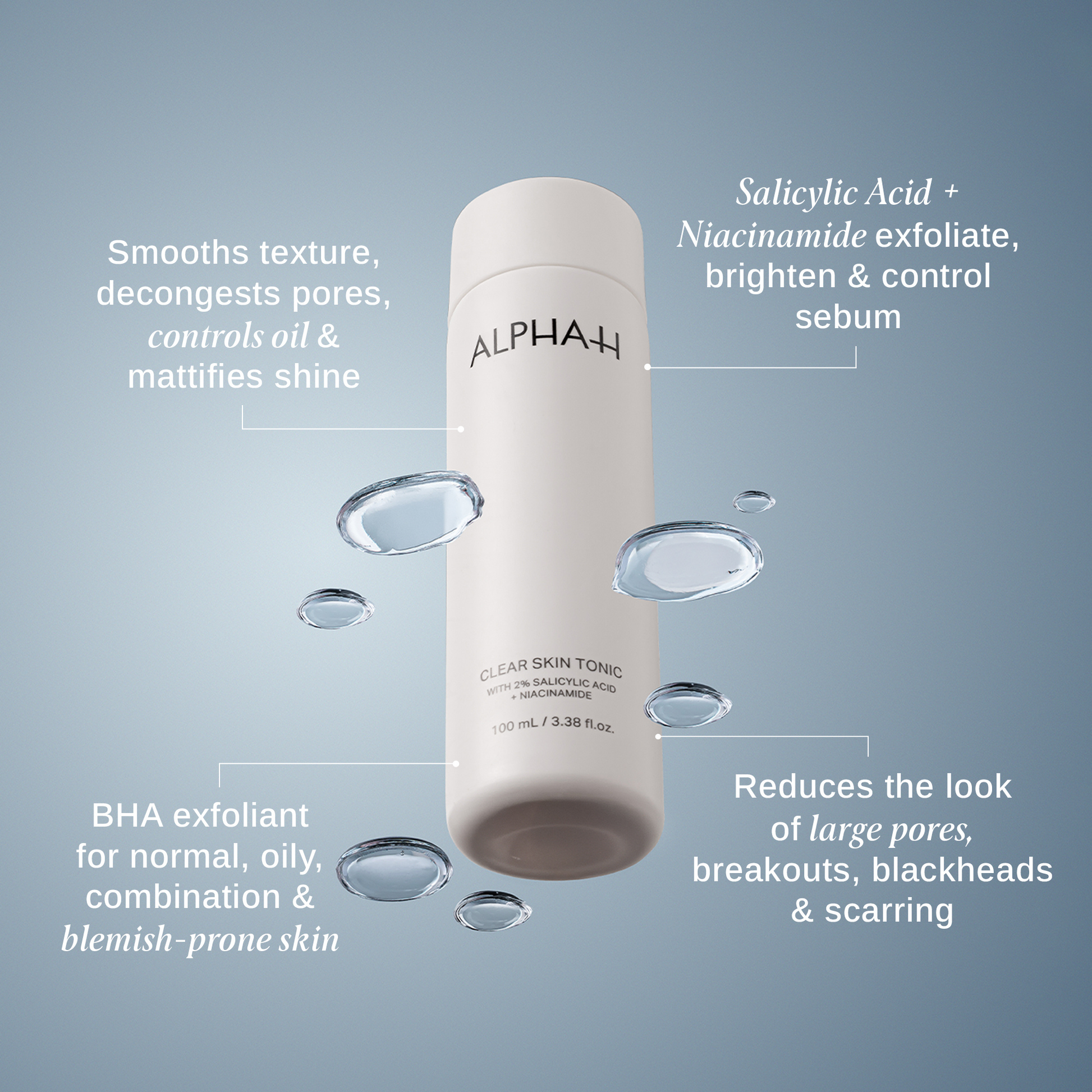 Take control of breakouts and excess shine with Alpha-H Clear Skin Tonic with 2% Salicylic Acid + Niacinamide. This high-performance exfoliating tonic combines the power of Salicylic Acid (BHA) with barrier-strengthening Niacinamide (Vitamin B3) to unclog pores, smooth skin texture, and balance oil production without stripping the skin.