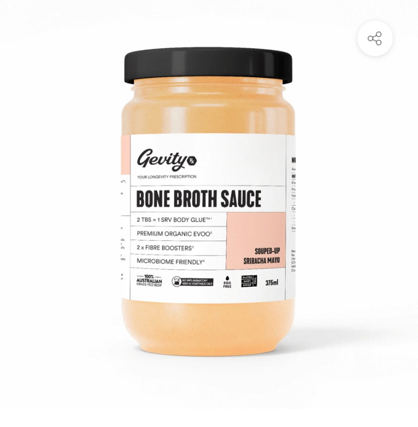 Like all our Bone Broth Sauces - our Souped-Up Sriracha Mayo is made to love your guts with a half serve of our 10x Body Glue™ Bone Broth in every serve! It's made with the healthiest oil on the planet - EVOO, is high in prebiotic fibre and is egg and additive free. With the added zing of jalapenos and red peppers, those that love a bit of spice in their life will love it as much as their guts do!